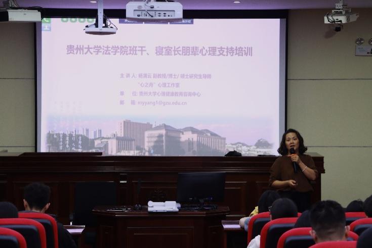 贵州大学法学院于2025年5月14日在模拟法庭举办心理健康专题讲座暨寝室长培训会。活动由学生科辅导员陈忍老师主持,校心理咨询中心副教授杨满云担任主讲,法学院各年级班委与寝室长参与,围绕“识别心理危机信号、规范上报流程、掌握应急支持技巧、构建四级联动机制”四大目标展开。