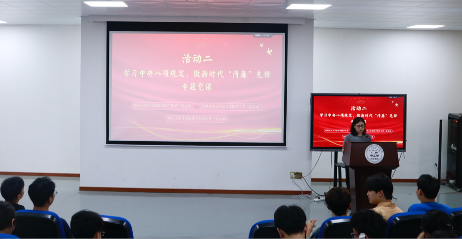 参观结束后,三个支部在党员活动室共同开展学习会议。各支部书记分别介绍了支部建设情况,涵盖党员规模、组织活动特色及党建成果等。法学院支部书记谭璐以“学习中央八项规定,做新时代清廉先锋”为主题讲授专题党课,通过案例解析、宣传片展播及理论讲解,引导党员深刻认识严守廉洁纪律的重要性。党员们专注聆听、认真记录,纷纷表示要将廉洁纪律要求内化于心、外化于行,以更严格的标准规范自身言行。会上,三支部党员还围绕法医学培养方案、尸检规范、司法考试难度、法学职业前景等专业问题进行深入交流,进一步打破学科壁垒,拓宽跨学科思维视野。