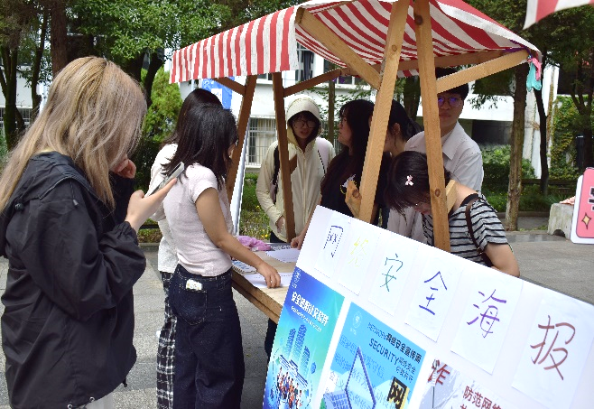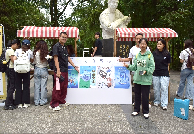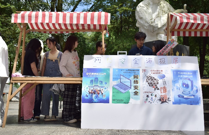 同学们通过扫描专属二维码进行答题,获得钥匙扣、明信片、笔记本等奖品。答题内容不仅包括基础常识类、实用技能类,还包括热点追踪类,通过聚焦《中华人民共和国网络安全法》《中华人民共和国个人信息保护法》等法律要点,解析虚假客服退款、游戏账号交易诈骗、冒充好友电话转账等校园高频骗局,多方面了解网络诈骗与网络安全。与此同时,线下还设置了网络安全海报展览区,涵盖了网络安全、电信诈骗、个人信息保护等主题,为校园网络安全敲响警钟。