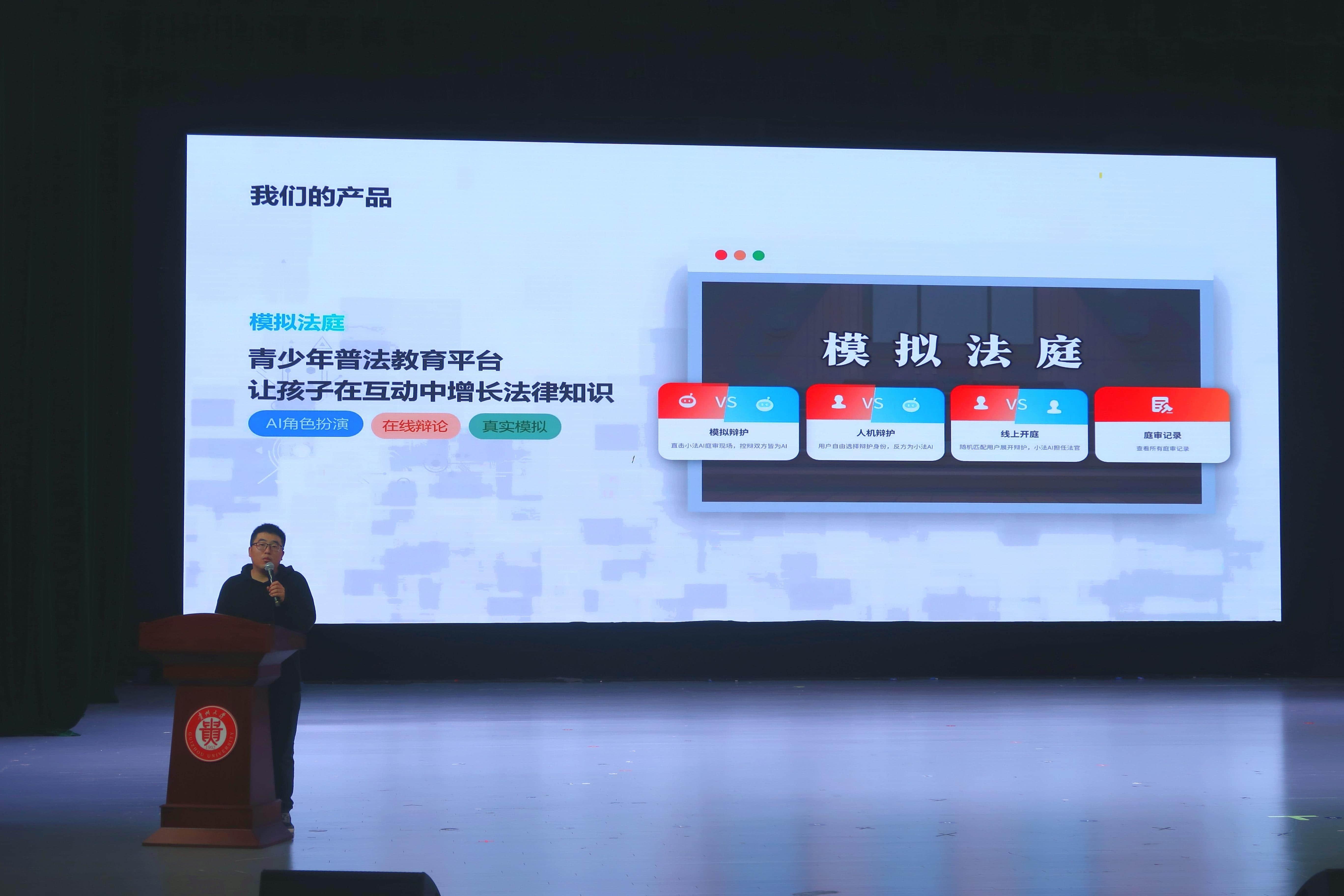 在主题分享环节,贵州大学省部共建公共大数据国家重点实验室软件工程博士研究生杨志同学介绍了AI技术在法律服务领域的创新应用,重点展示了团队开发的AI模拟法庭和青少年普法教育平台,通过互动式学习方式帮助青少年掌握法律知识,提升法治意识。