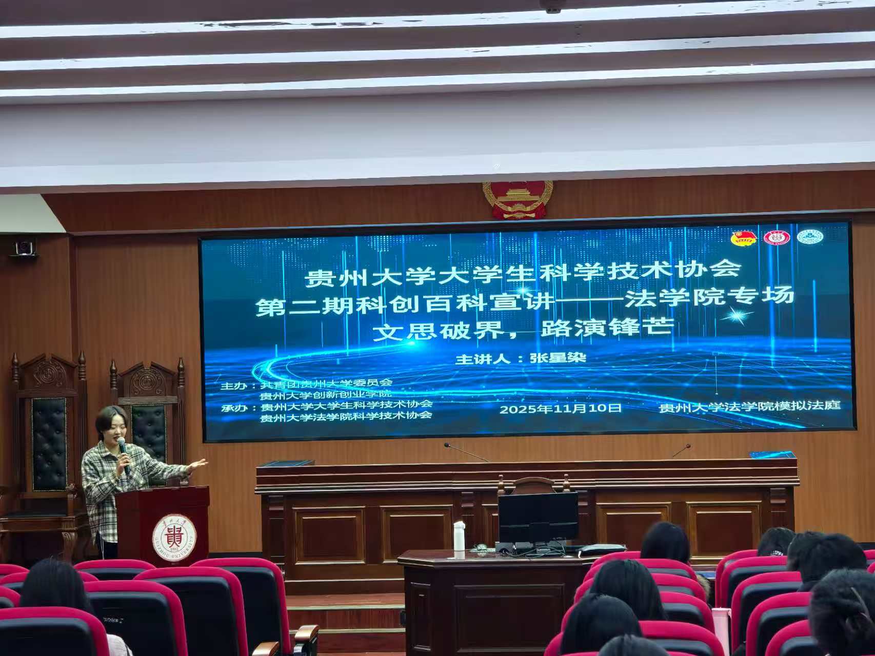 为切实激发学生科创热情、提升学生项目展示与路演实战能力,2025年11月10日,贵州大学大学生科学技术协会第二期科创百科宣讲——法学院专场“文思破界,路演锋芒”活动在贵州大学法学院模拟法庭成功举办。