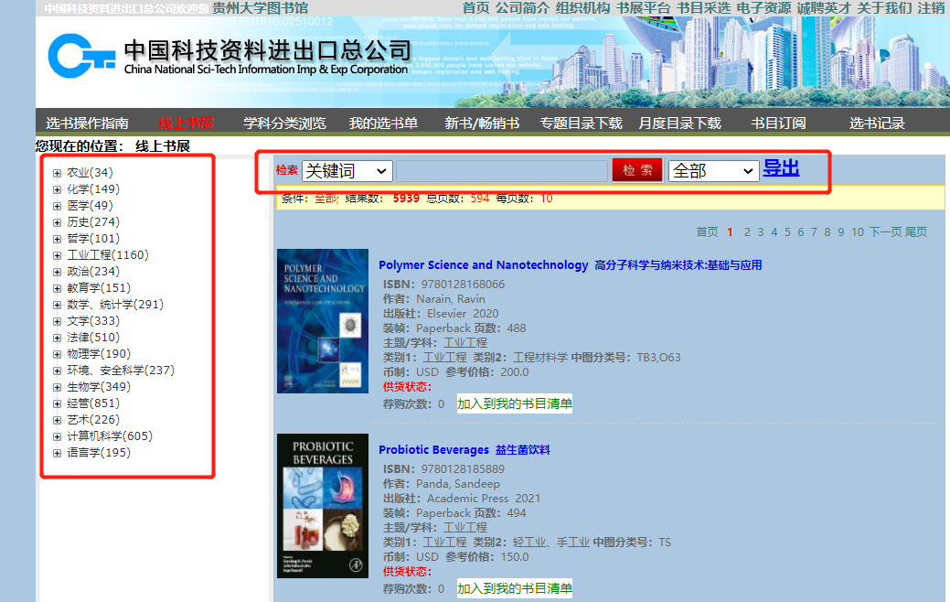 为了更好地服务学校教学和科研,在疫情期间足不出户的条件下满足师生对外文原版文献的阅读需求,贵州大学图书馆联合中国科技资料进出口总公司于2022年至516-2022年年618日  2022年外文原版图书线上书展活动。此次书展汇聚Oxford University PressJohn Wiley & Sons Inc.SpringerTaylor & FrancisCambridge University PressElsevierDe GruyterPeter Lang等国际一流出版社约5000余种,涵盖学科:语言学、教育学、文学、管理、经济、法律、哲学、政治、历史、艺术、工程、电子、农业、环境、生物、药学、化学、数学、物理、计算机等。