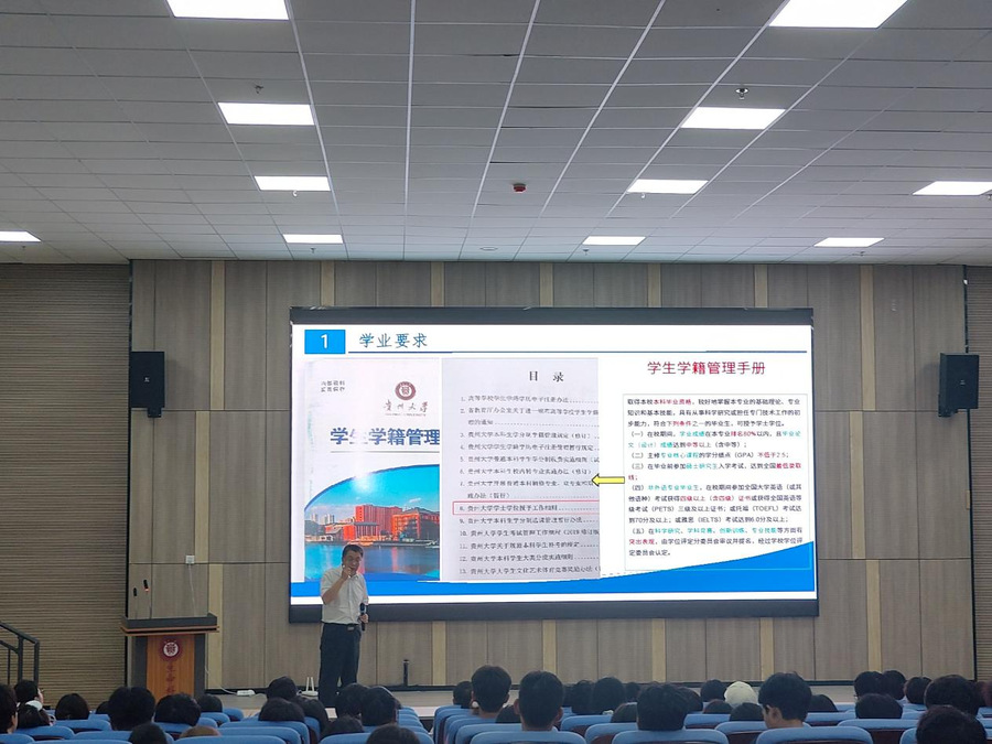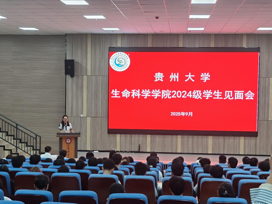 2025年9月18日19:00,贵州大学生命科学学院2024级本科学生见面会在西校区崇德楼104报告厅顺利举行,院党委书记徐进,院长吕立堂,副院长江龙、胡国雄、牛素贞出席会议,各系主任、辅导员、班主任和2024级全体学生参加了会议,会议由院党委副书记熊静主持。