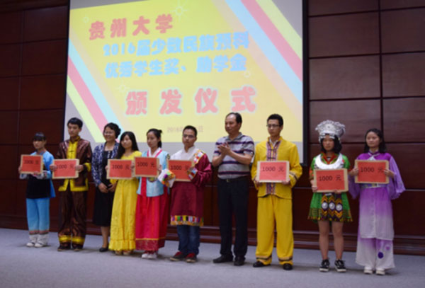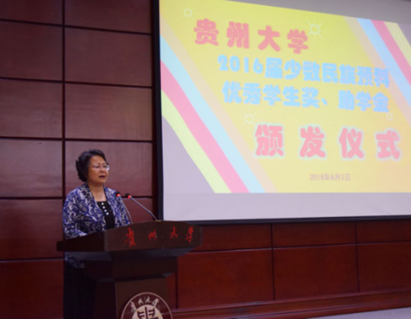 少数民族优秀预科学生奖、助学金的发放是我省党和政府贯彻落实习近平总书记关于民族工作系列重要讲话精神在民族团结进步创建工作中的具体体现。 6月3日,为了落实省委、省政府创建民族团结进步繁荣发展示范区的系列重要指示精神,在贵州大学少数民族预科学生中间培育典型,推动少数民族预科教育和管理在贵州大学广泛深入持久地开展,贵州大学在一号行政报告厅举行2016届少数民族预科优秀学生奖、助学金颁发仪式。 省民委巡视员刘晖、文教处处长黄家逊、贵州大学党委副书记杨伟民、招就处、教务处负责同志和身着各民族服装的2016届全体251名少数民族预科生出席了此次颁奖仪式。在场的各民族同学们脸上洋溢着幸福的笑容。傣族姑娘的长摆裙绚丽多彩,苗族姑娘的银饰叮当作响,侗族小伙礼服刺绣的精美,白族姑娘包头帽箍的淡雅,真是一派“56个民族56枝花”一齐绽放的场面。