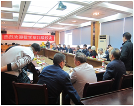 18日上午10点整,原数学系74级校友于博学楼313会议室组织了校友座谈会。本次会议由校友张国学主持,杨通永、朱华、宋玉筑等18个校友及他们的恩师陶闻捷、王图坤、刘成利等8位老教师共26人参加.