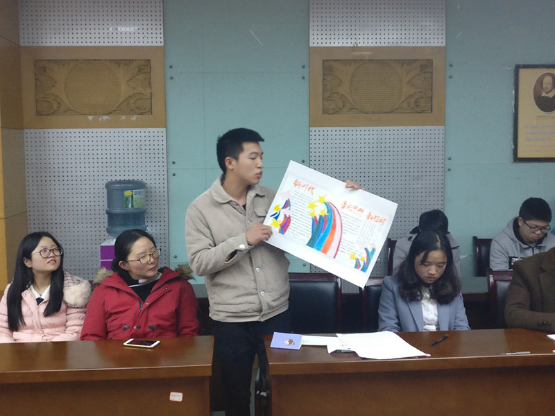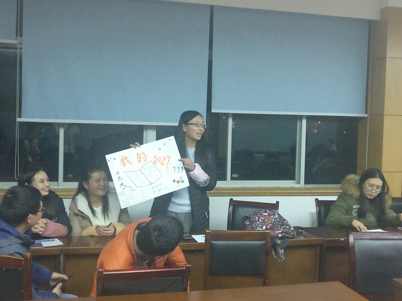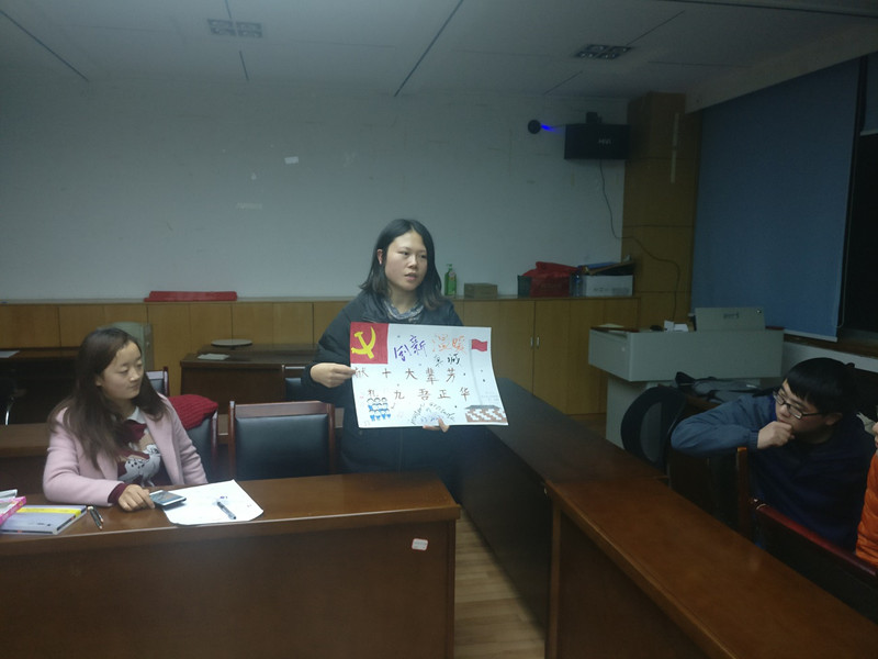 活动伊始,同学们自由组队为5人一组,每组成员根据党的十九大的十大关键词制作出一张祝福党的海报,大家都对自己未来的十年做出了规划或承诺。研究生希望自己能够顺利完成学业然后有着更好的机会发展,本科生都有或保研或考研或找工作的打算。大家对未来充满希望,自信是他们前进的源头,在他们身上感受到作为党的新一代接班人的蓬勃朝气!海报逐渐完成,每组都争先恐后的介绍着自己作品的含义,其中一组由苹果的典故上升到国家发展的海报和另外一组关于“四个伟大”的海报更是让大家眼前一亮,拍手叫好。