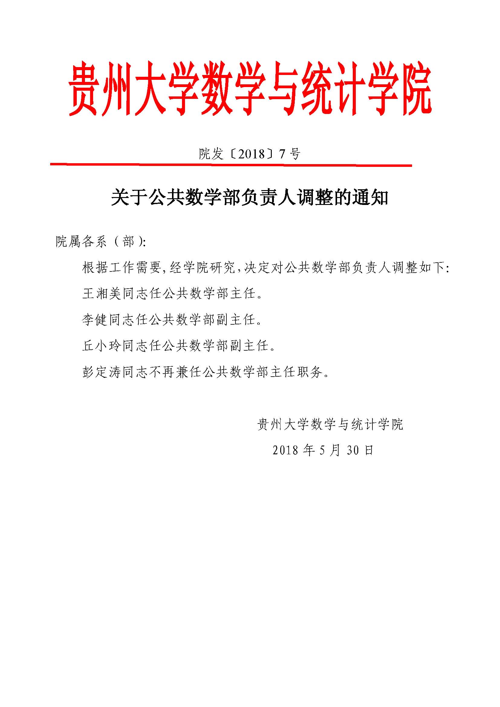 关于公共数学部负责人调整的通知