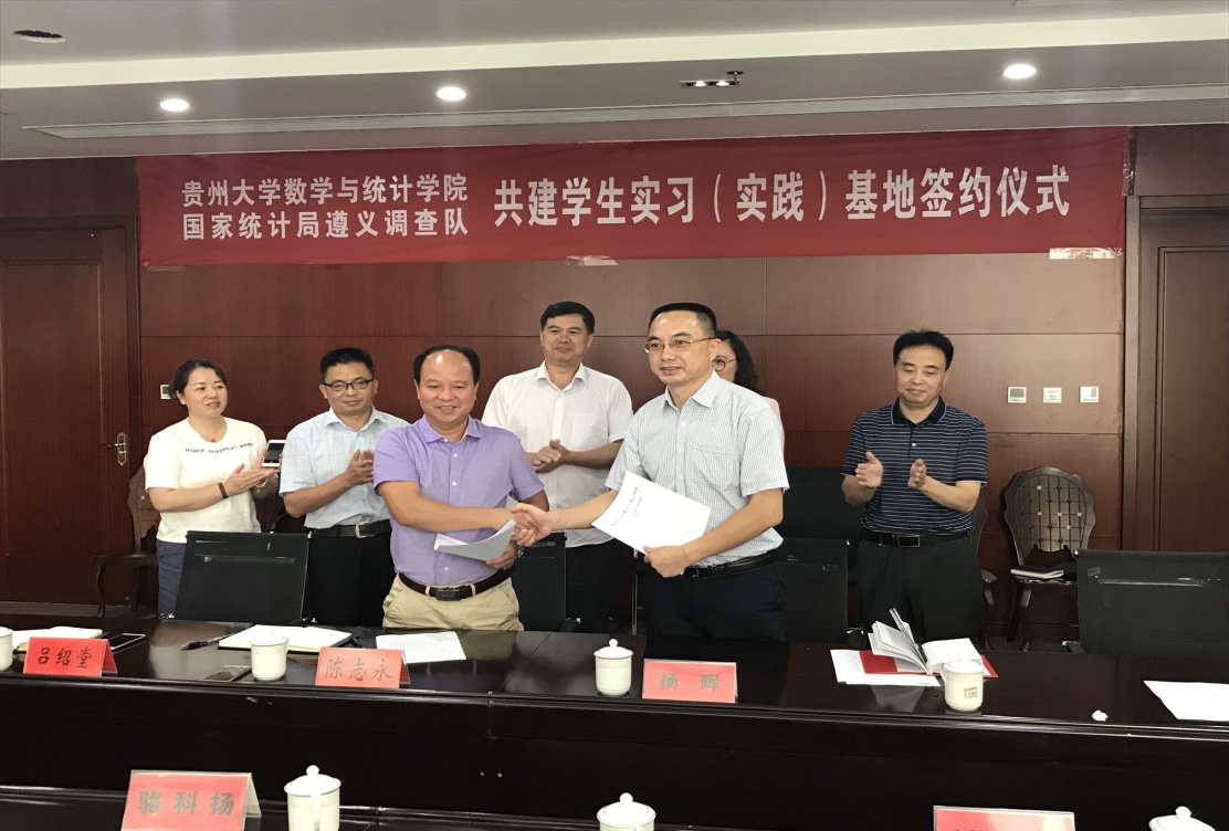 在双方共同见证下,杨辉院长与陈志永队长签订了“贵州大学数学与统计学和国家统计局遵义调查队共建学生实习(实践)基地协议书”,伴随着热烈的掌声,数学与统计学院骆科扬书记和国家统计局遵义调查队陈志永队长为实习(实践)基地正式揭牌,至此,数学与统计学院和国家统计局遵义调查队战略合作落地建成。揭牌仪式由冯金友副队长主持,遵义队全体职工、学院教学科研科、统计系师生代表共30余人出席了揭牌仪式。