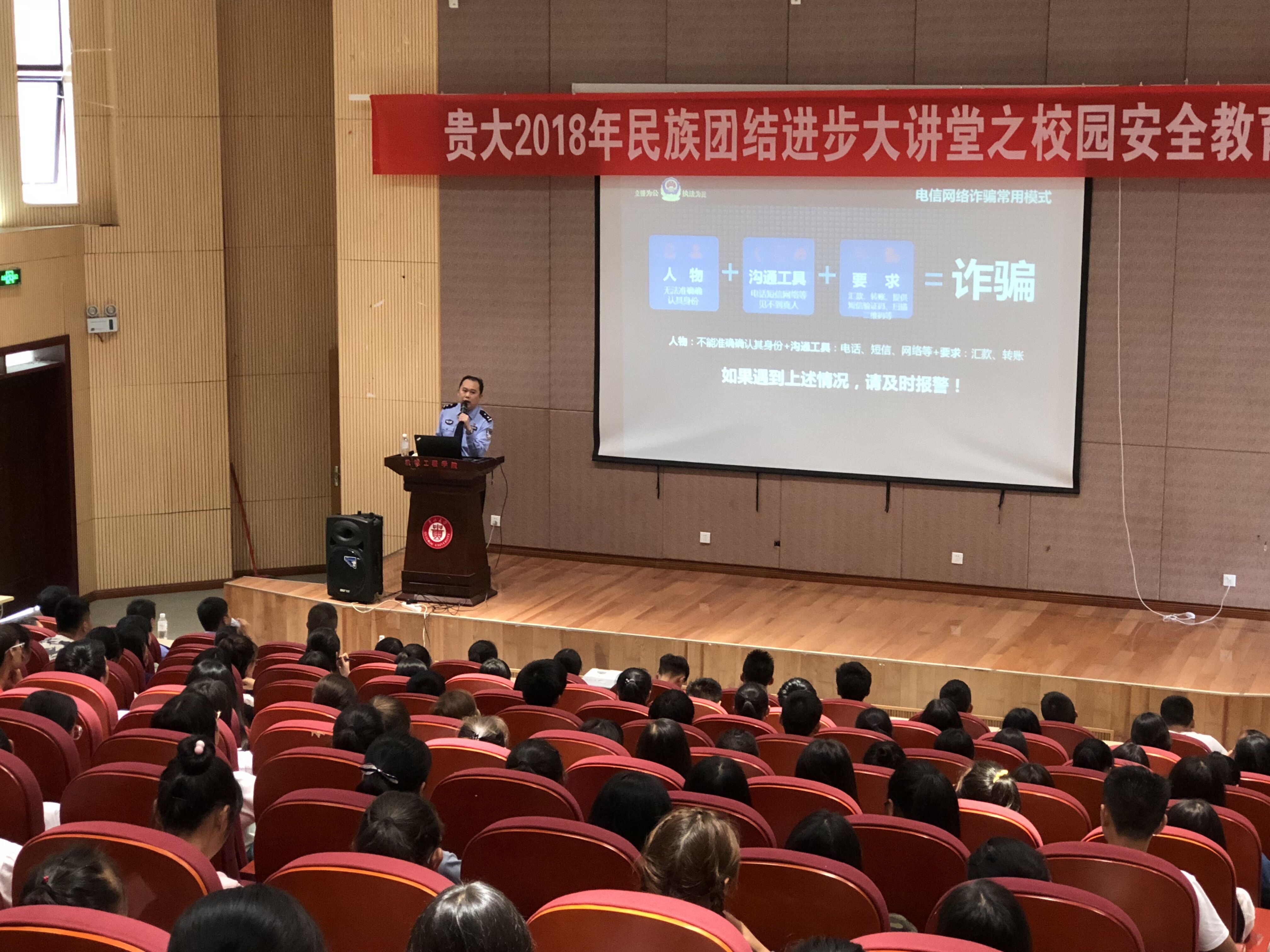 贵大新闻网讯(陈朝东 马哲 报道|摄影 贾秀楠 ) 近年来,各种各样的新型网络消费方式为大学生们带来了实惠和便利,同时也给不法分子利用现代通讯技术和网络结算方式实施诈骗等犯罪活动提供了可乘之机。9月21日下午,为有效遏制电信诈骗犯罪案件在大学生中间高发的态势,特别是切实维护刚刚离开父母身边进入大学的新同学的利益,提升他们防范电信网络诈骗的安全意识,数学与统计学院邀请贵阳市公安局反电信网络诈骗中心、花溪分局刑侦大队情报中队、松山派出所五名警官做客数学与统计学院民族团结进步大讲堂向2018级少数民族卓越班、预科班近400名各民族新同学宣讲如何预防电信网络诈骗。 讲座中,来自各单位的五名警官分别从电信诈骗犯罪特征、兼职刷单、网络购物退款诈骗、校园贷等日常生活中最常见的电信网络诈骗给大家细心做讲解,使现场聆听的同学们惊叹于当前电信网络诈骗犯罪活动蔓延之广、诈骗手段翻新速度之快、反侦查能力之强。在宣讲中,各位警官一再提醒新同学们要加强防范意识并告诫新同学们要树立正确的消费观,做为新时代的大学生在生活中不应攀比而是做到理性消费;不要怀揣侥幸心理贪小便宜或是超前消费从而陷入社会上各种“套路贷”的骗局。