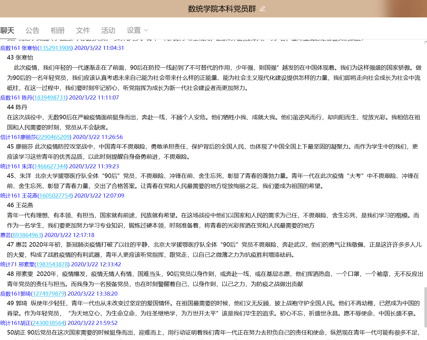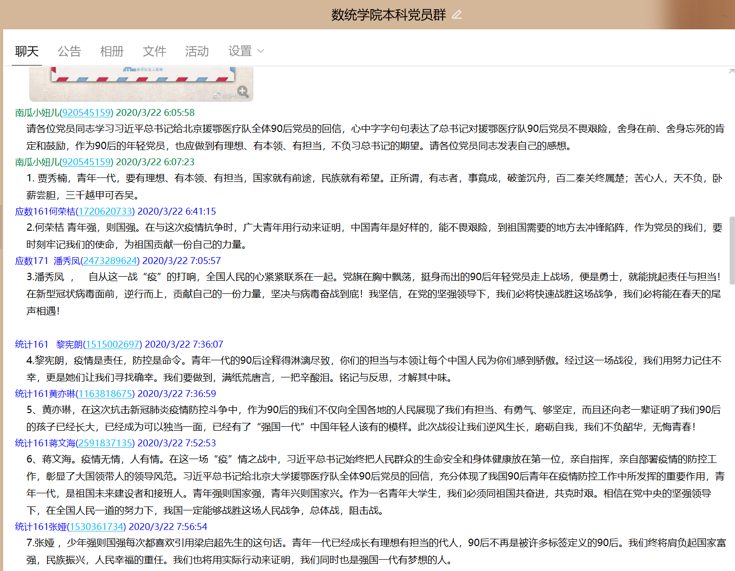 3月15日习近平总书记给北京大学援鄂医疗队全体“90后”党员回信。习近平在回信中表示,在新冠肺炎疫情防控斗争中,你们青年人同在一线英勇奋战的广大疫情防控人员一道,不畏艰险、冲锋在前、舍生忘死,彰显了青春的蓬勃力量,交出了合格答卷。 从回信中我们看到习近平对“90后”冲在前线的青年的关心并致以诚挚的问候。让我们深刻感受到“广大青年用行动证明新时代的中国青年是好样的,是堪当大任的!” 这不仅仅是对北京大学援鄂医疗队全体“90后”党员的回信,更是对广大青年的回信。总书记的回信,温暖亲切、语重心长、催人奋进,极大地鼓舞了广大医务工作者和“90后”战“疫”必胜的坚定信心。在数统学院学生党支部的组织和号召下,学生党员们也在第一时间深入学习了习近平总书记的重要讲话精神,一起来看看大家的心得体会吧!