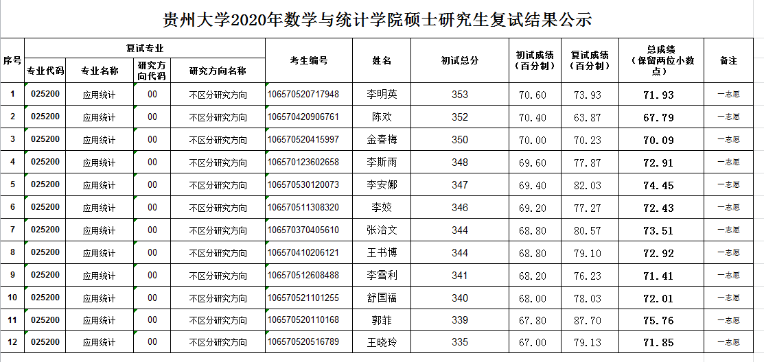 数学与统计学院2020年应用统计专业硕士研究生复试结果公示