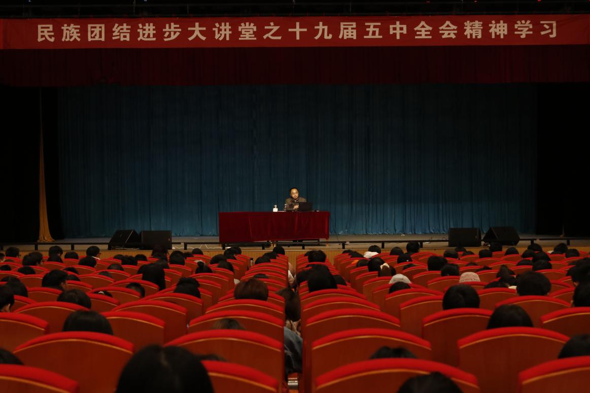 (文字 数学与统计学院团委 摄影 胡泽兵) 11月25日晚19:30,南校区大礼堂灯火通明,贵州大学第31期团校暨数学与统计学院分团校首次授课,我院党委书记杨辉教授走进民族团结进步大讲堂,向2020级少数民族预科全体同学做了《认真学习十九届五中全会精神、深刻领会习近平新时代中国特色社会主义思想》专题报告。