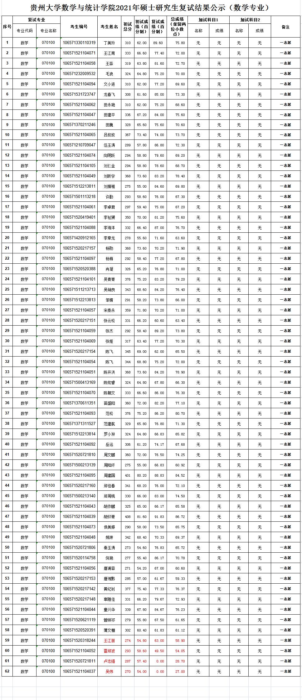 贵州大学数学与统计学院2021年硕士研究生复试结果公示(数学专业)