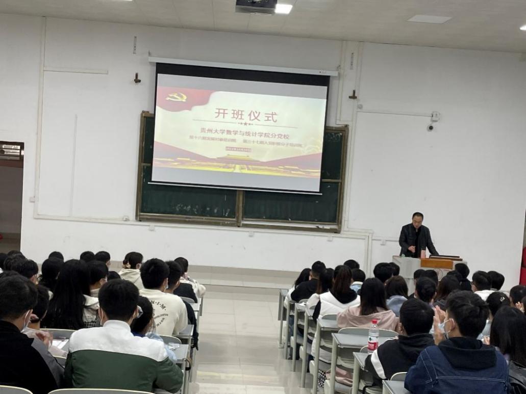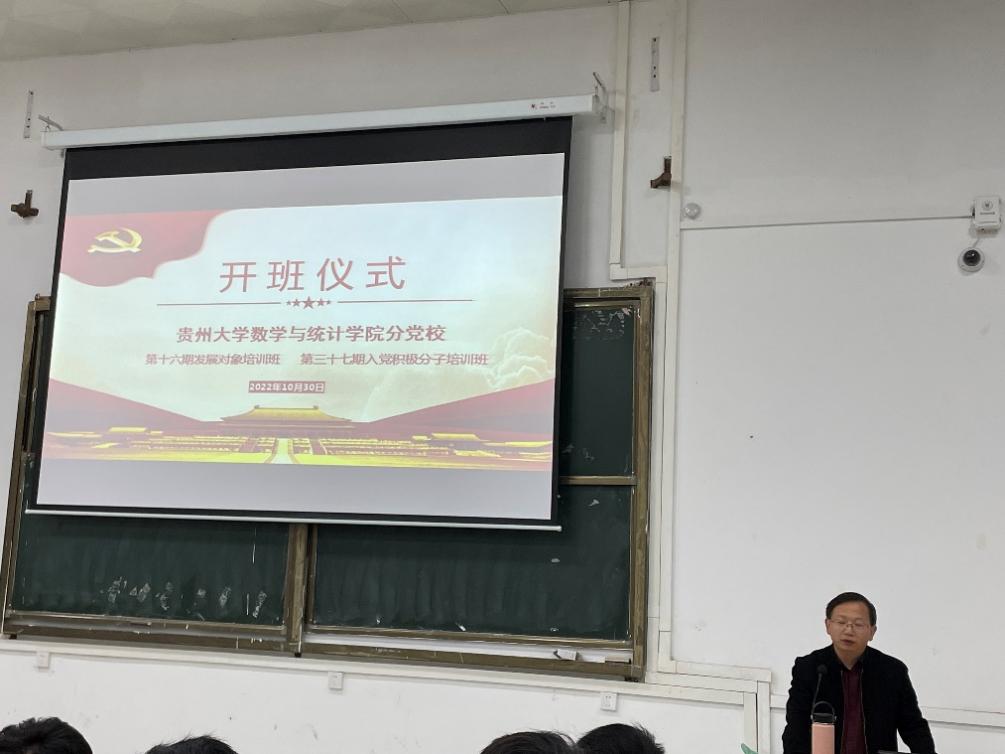 2022年10月30日下午15:00,数学与统计学院分党校第三十七期入党积极分子培训班及第十六期发展对象培训班开班仪式在东校区法学楼101教室举行。学院党委书记杨辉出席开班仪式,教工第一党支部书记罗贤兵、各学生党支部书记以及培训班全体学员参加开班仪式。开班仪式由罗贤兵主持。