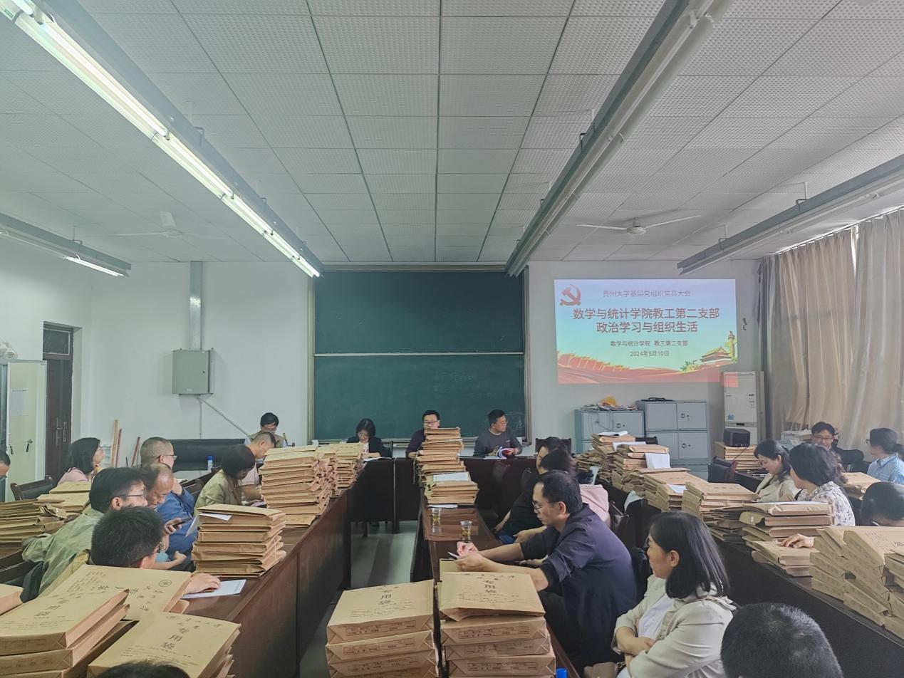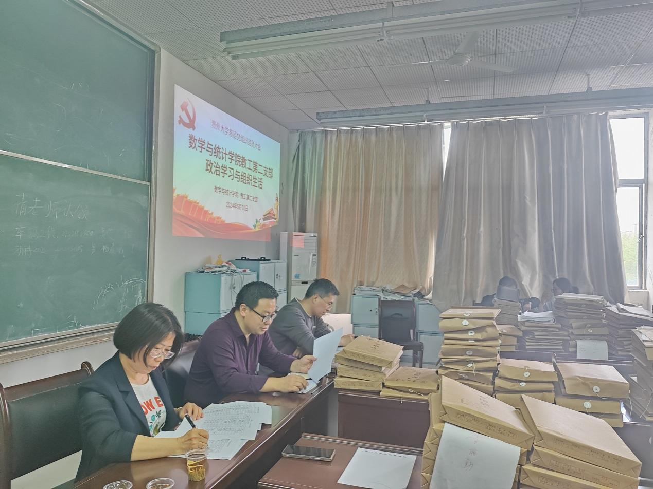 数学与统计学院教工第二党支部 开展政治理论学习与组织生活活动 5月10日下午,贵州大学数学与统计学院教工第二党支部在西校区工程实训中心324会议室开展政治理论学习与组织生活活动,支部全体党员及公共数学部的全体教师参加了此次活动,学院党委书记于松出席了本次活动,活动由党支部书记彭定涛主持。 本次活动围绕两个主题:一、重温习近平总书记2011年视察贵州大学“5.9”重要讲话;二、学习《中国共产党纪律处分条例》。
