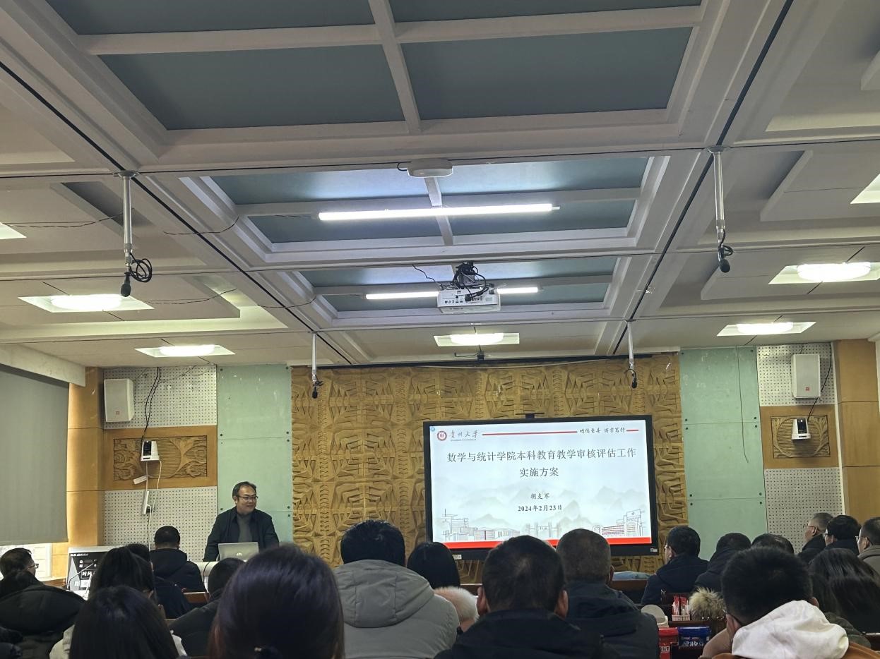 数学与统计学院于 2024 年 2月 23 日下午召开了全院教师工作会议,分管本科教学的胡支军副院长首先传达了陈祥盛副校长在新学期全校处级干部大会上所做的本科教育教学工作汇报,然后向全院教职工详细介绍了数学与统计学院本科教育教学审核评估工作实施方案,对学院审核评估工作进行了动员,确保全员参与,全员投入,强调每个教职员工必须以评估工作的大局为重,服从学校及学院的统一安排,以强烈的责任感、使命感和饱满的工作热情,高质量的完成各项工作任务。