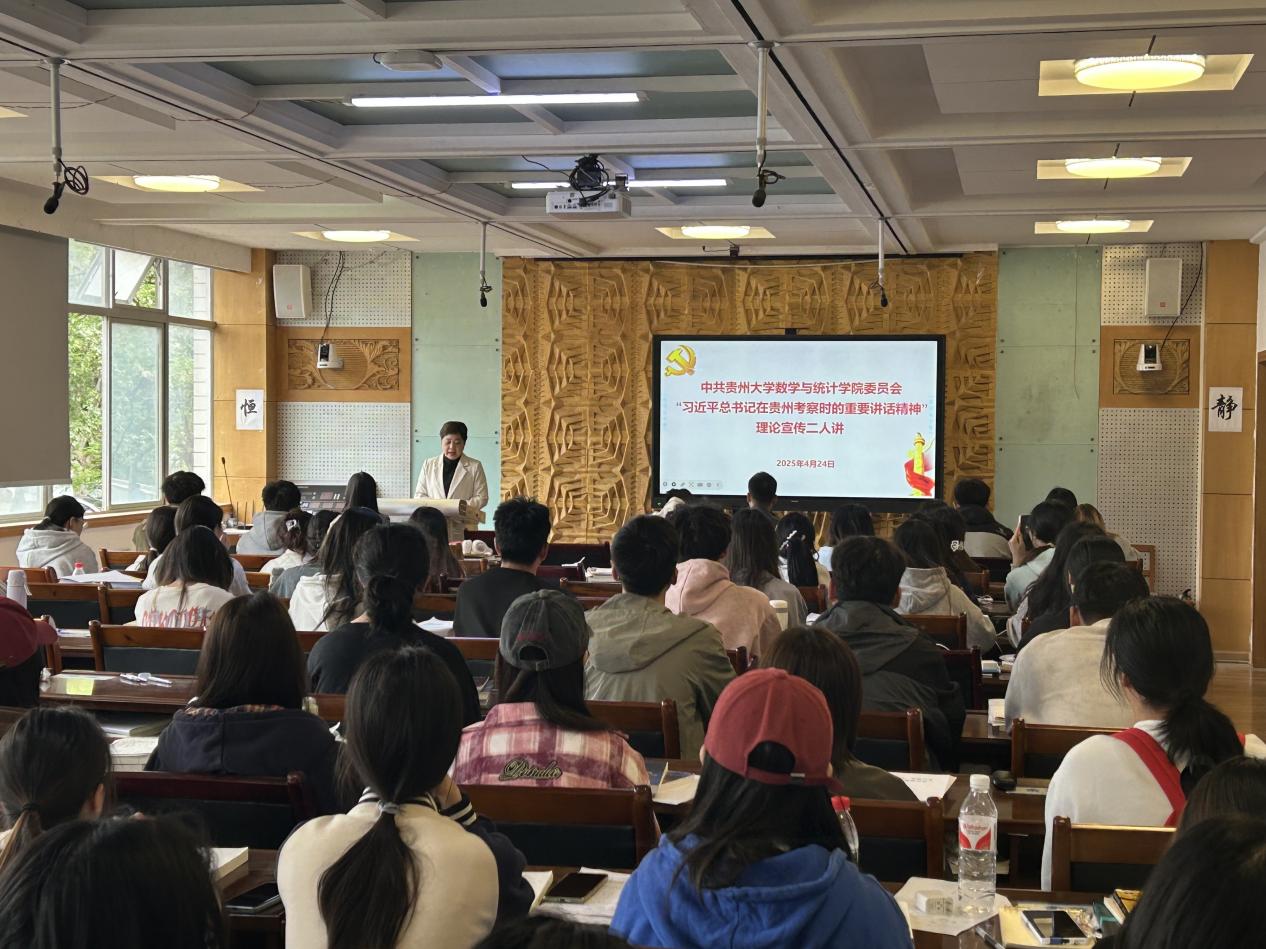 为深入贯彻习近平总书记在贵州考察时的重要讲话精神,强化党建引领作用,精准把握贵州在国家发展战略中的定位,数学与统计学院于2025年4月24日15:00,在博学楼329会议室开展学习贯彻习近平总书记在贵州考察时的重要讲话精神“理论宣传二人讲”宣讲活动。学院领导、师生代表等共计80余人参加,共同探讨了在中国式现代化建设进程中所彰显的贵州独特风貌。