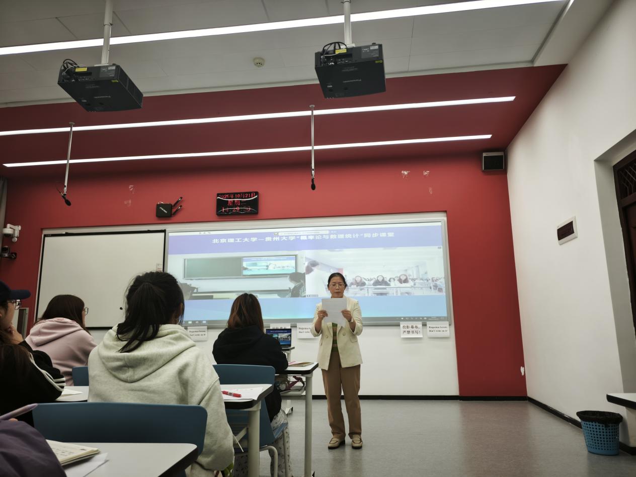 2025年10月21日,一场跨越地域的沉浸式远程直播互动课堂,将贵州大学与北京理工大学紧密相连。作为“慕课西行计划” 的生动实践,北京理工大学赵鲁涛教授以《概率论与数理统计》中“随机变量方差的应用”为主题,为两校学子带来一堂兼具知识深度与实践趣味的云端课程,推动优质教育资源跨区域流动,为高等教育区域协同发展注入活力。 活动伊始,贵州大学公共数学部丘小玲主任代表数学与统计学院发表致辞,对北京理工大学的支持表示衷心感谢,并强调了此次合作对于推动高等教育区域协同发展的重要意义。她指出:“中西部高等教育资源存在显著差距,北京理工大学在数学建模、应用统计等领域的深厚积淀,正是我们急需借鉴的宝贵财富。”此次同步课堂的开展,不仅是一次知识的传递,更是两校教育智慧深度交流与融合的开始。