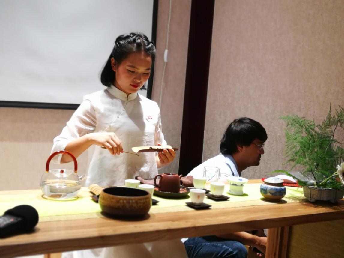 贵州古田贸易有限公司副总经理汪梦凡(图左二)认为,茶更像一种精神,可以搭建起人与人之间沟通的桥梁。她说,“今天来到这里我突然间觉得大家相互的交流我感受到一点,我觉得茶它实际上是一个人的一种精神,是一种思想境界、一种沟通方式、一种桥梁,所以我们来到这里我觉得更多的是天、人、地讲的是一个和,我们来喝茶的时候其实就是一种和气。”