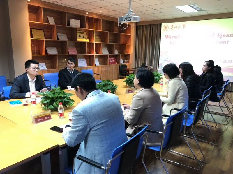 2018年10月24日下午,英国诺森比亚大学Ignazio Abras教授和朱磊老师一行莅临贵州大学管理学院进行学术与项目交流访问。学院副院长王婷教授、副院长宋山梅教授、EDP中心主任张勇教授、创新创业中心主任刘遗志副教授以及汤美润老师等接待了来访外宾,双方进行了友好的洽谈。