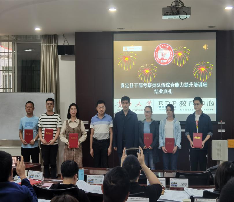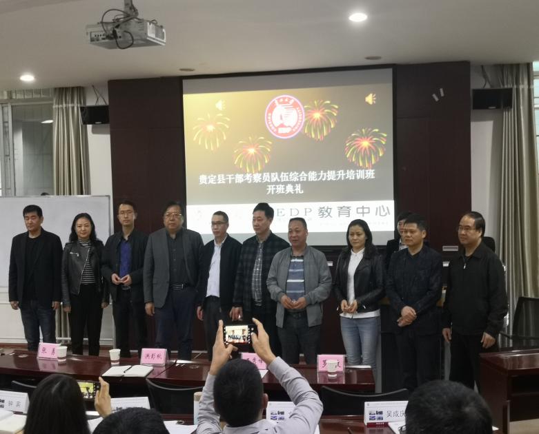 3月29日-4月2日,《贵定县干部考察队伍综合能力提升培训班》在贵州大学北校区管理学院举行。贵州大学管理学院党委书记王秀峰教授,副书记洪影秋、副院长宋山梅教授、副院长罗敏教授和EDP中心主任张勇教授参加了此次培训活动。来自贵定县的主要基层负责人,各机关骨干成员,县委组织部主要负责人共计60名学员参加了此次培训,此次培训活动由贵州大学EDP教育中心承办。