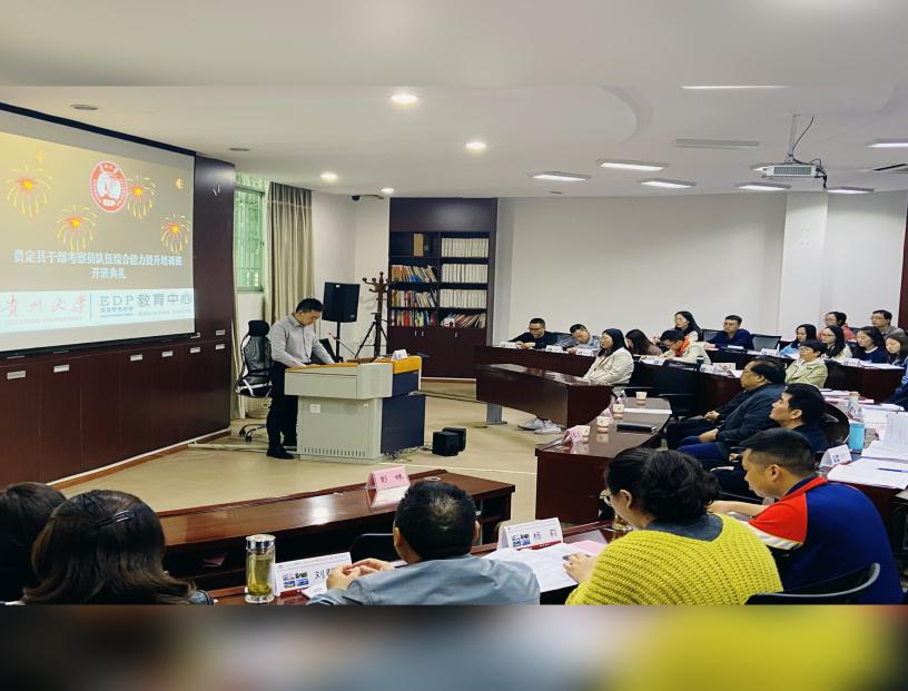 贵州大学管理学院副院长宋山梅致辞。她表示,根据中共贵定县委组织部《关于举办干部考察员队伍综合能力提升培训班的通知》。以保障县、镇、村换届工作为主要目的,通过组织干部考察员队伍综合能力提升班来提升全县干部考察工作的科学化、规范化水平。干部考察工作是干部选拔任用的重要一环,建立一支知事识人的考察员队伍,是提高选人用人工作水平的迫切需要。干部考察员要在熟悉政策上下功夫,注重学思结合,做到融会贯通。我校高度重视此次培训工作,管理学院及EDP中心相关负责人及老师积极开展一系列筹备工作,保证培训顺利开展。