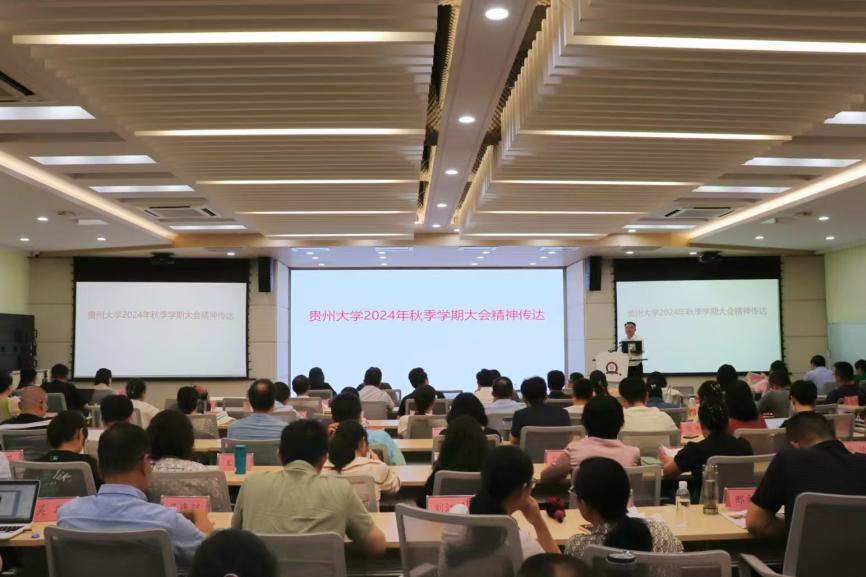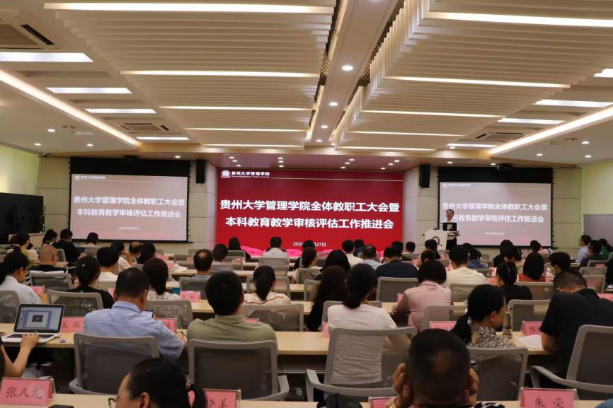 2024年8月27日中午12:40,贵州大学管理学院全体教职工大会暨本科教育教学审核评估工作推进会在东校区致远楼三楼报告厅召开。会议由管理学院院长李烨教授主持,学院全体教职工参加。