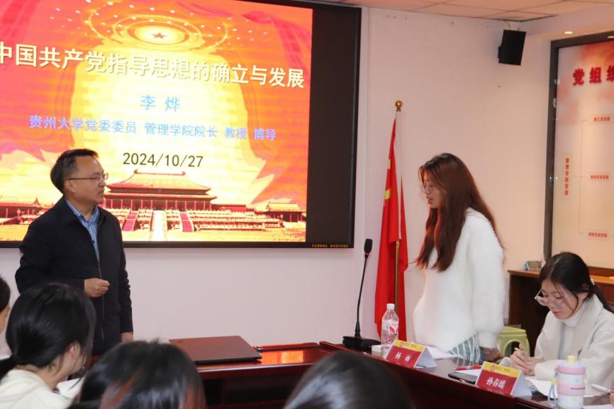 2024年10月27日下午,管理学院第四十一期入党积极分子培训班专题党课在致远楼301室顺利开展。本次课程由贵州大学党委委员、管理学院党委副书记、院长李烨主讲,主题为“中国共产党指导思想的确立与发展”。