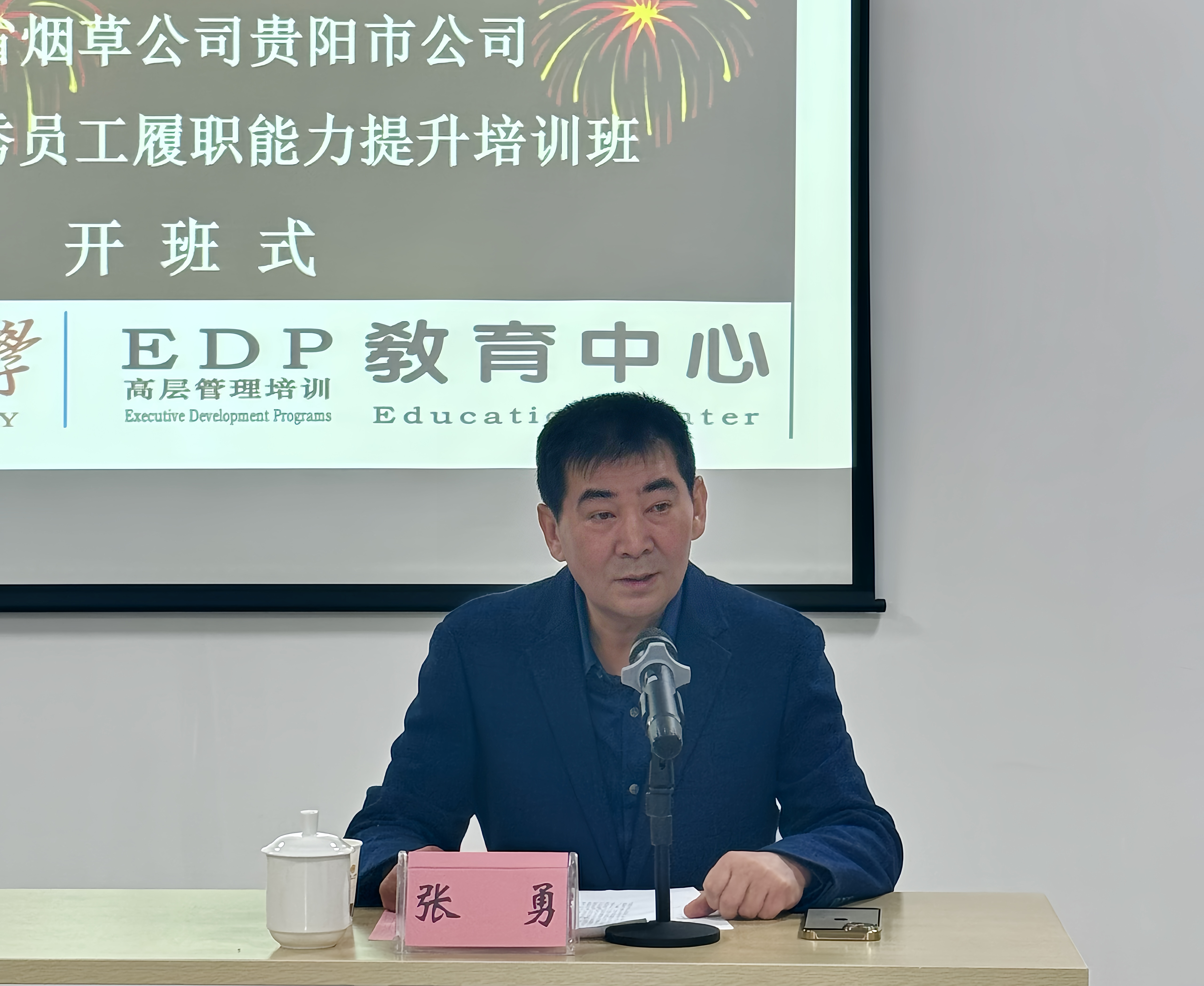 贵州大学管理学院EDP教育中心主任张勇在开班式上,代表中心向贵州省烟草公司贵阳市公司的信任和指导表示衷心的感谢!向各位领导、学员的到来表示热烈的欢迎!希望全体学员提高政治站位,珍惜培训机会,认真参训,进一步坚定理想信念、增强党性修养、提升理论水平,增强履职能力,切实增强责任感、使命感和紧迫感,时刻保持学习的热情和求知的渴望,不断充实自己,提升自己的综合素质和能力水平,为贵州烟草高质量发展和强化烟草行业管理工作贡献力量。