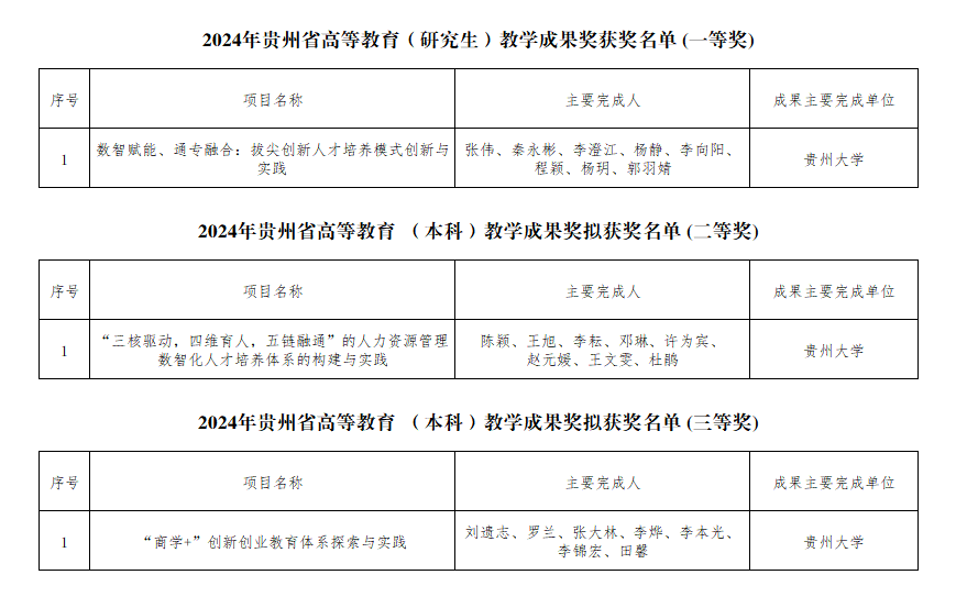 近日,贵州省教育厅发布了《省教育厅关于公布2024年贵州省高等教育省级教学成果奖获奖名单的通知》,贵州大学共51项教学成果获奖,其中管理学院有3项教学成果获奖。