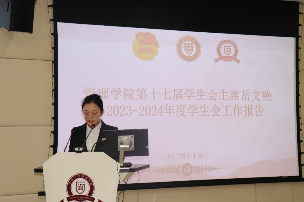 管理学院第十七届学生会执行主席岳文燕,做2023-2024年度学生会工作报告。