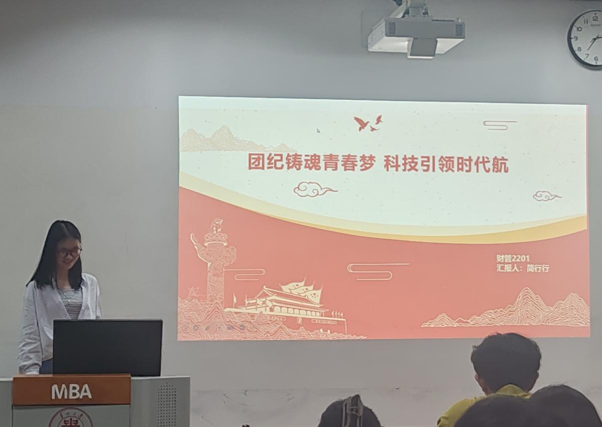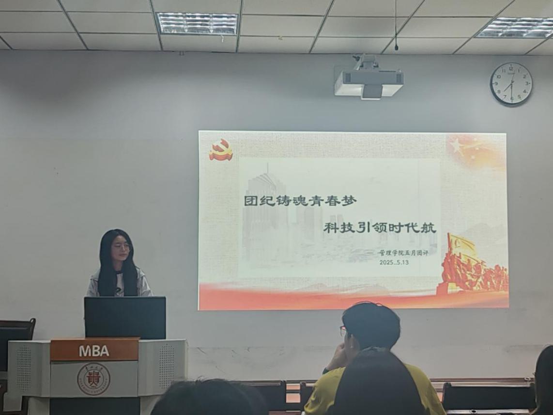管理学院于2025年5月13日晚7点在慎思楼MBA教育中心203报告厅开展“团纪铸魂青春梦,科技引领时代航”主题团日活动评比。本次团日活动评委由主席团成员邓雨容、孙雲天、刘妍及院团委副书记(学生)苏孟岚担任。
