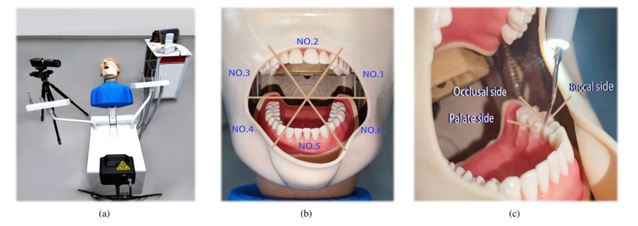 图 1. (a) 实验场景示意图,包括粒子测速设备、人体模型和超声波洁牙机;(b) 口腔牙齿分区示意图,其中口腔内的牙齿被分为六个主要区域;(c) 单颗牙齿分区示意图,其中每颗牙齿被分为三个表面。(c) 单颗牙齿的分区图,其中每颗牙齿分为三个表面、腭面、颊面和咬合面;