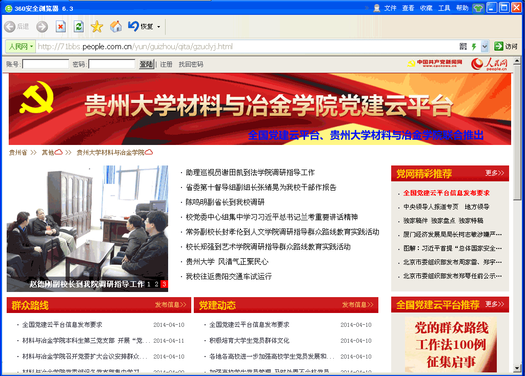 加入“全国党建云平台”,我院直接成为了中国共产党新闻网的通讯员单位,可直接向群众路线网、人民网、中国共产党新闻网等中央媒体供稿,相当于把我院党建的宣传平台或展示窗口直接开设到了北京,极大地促进了我院党建宣传工作。