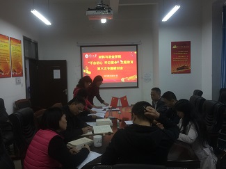 2019年10月21日下午,材料与冶金学院党委“不忘初心、牢记使命”主题教育第三次专题学习研讨会在学院楼431会议室举行,学校主题教育第四巡回组组长许道云、副组长黄梅、成员李臣宇、学院党委书记胡环宇、院长刘其斌、党委副书记张瑞良、副院长熊玉竹、向嵩、陈朝轶出席会议。