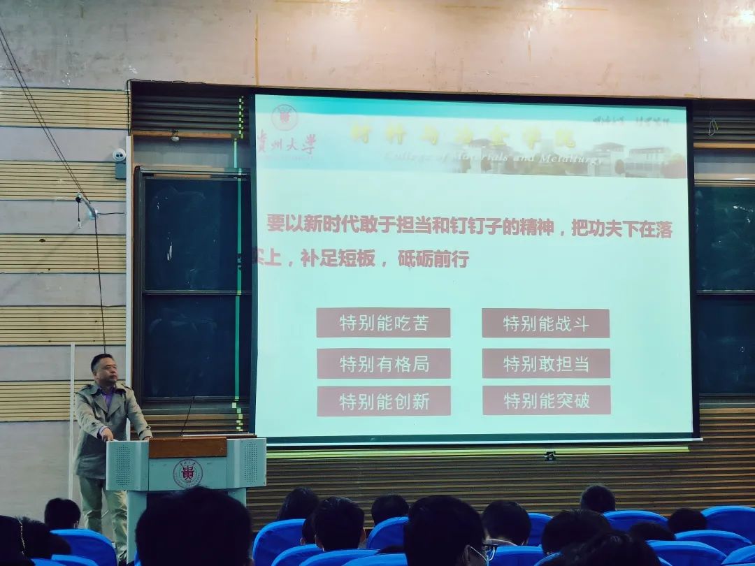刘其斌院长为新生作“材料与冶金学院2022级新时代大学生成才报告会”,并为新生讲述何为新时代以及阐述“材冶六特精神”的内涵——特别能吃苦、特别能战斗、特别有格局、特别敢担当、特别能创新、特别能突破。并对同学日后的学习生活寄予美好祝愿