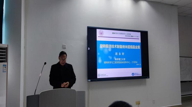 应贵州大学材料与冶金学院院长应刘其斌教授盛情邀请,河海大学材料学院院长赵永好教授于2024年1月6日为学院师生做“旋转锻造技术制备纳米超细晶金属”和“有组织的科学研究和项目申报”两场学术报告,学院100余名师生听取了报告。