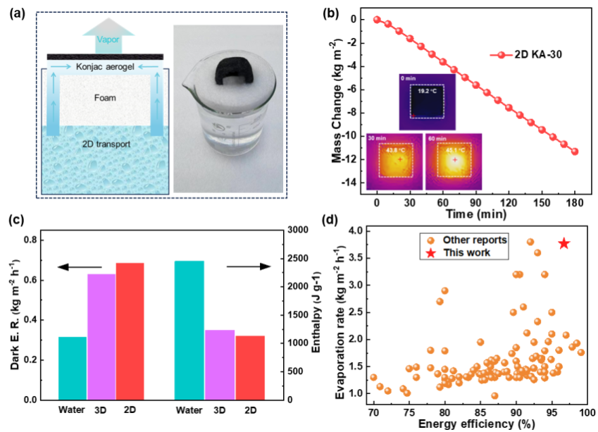 生物质材料,如木材、竹子和蘑菇等,因其良好的亲水性、独特的水传输通以及出色的热绝缘性能,在太阳能蒸发领域受到广泛关注。然而,由于供水和热绝缘的权衡关系设计不合理,导致生物基太阳能蒸发器的蒸发速率远低于石油基太阳能蒸发器。