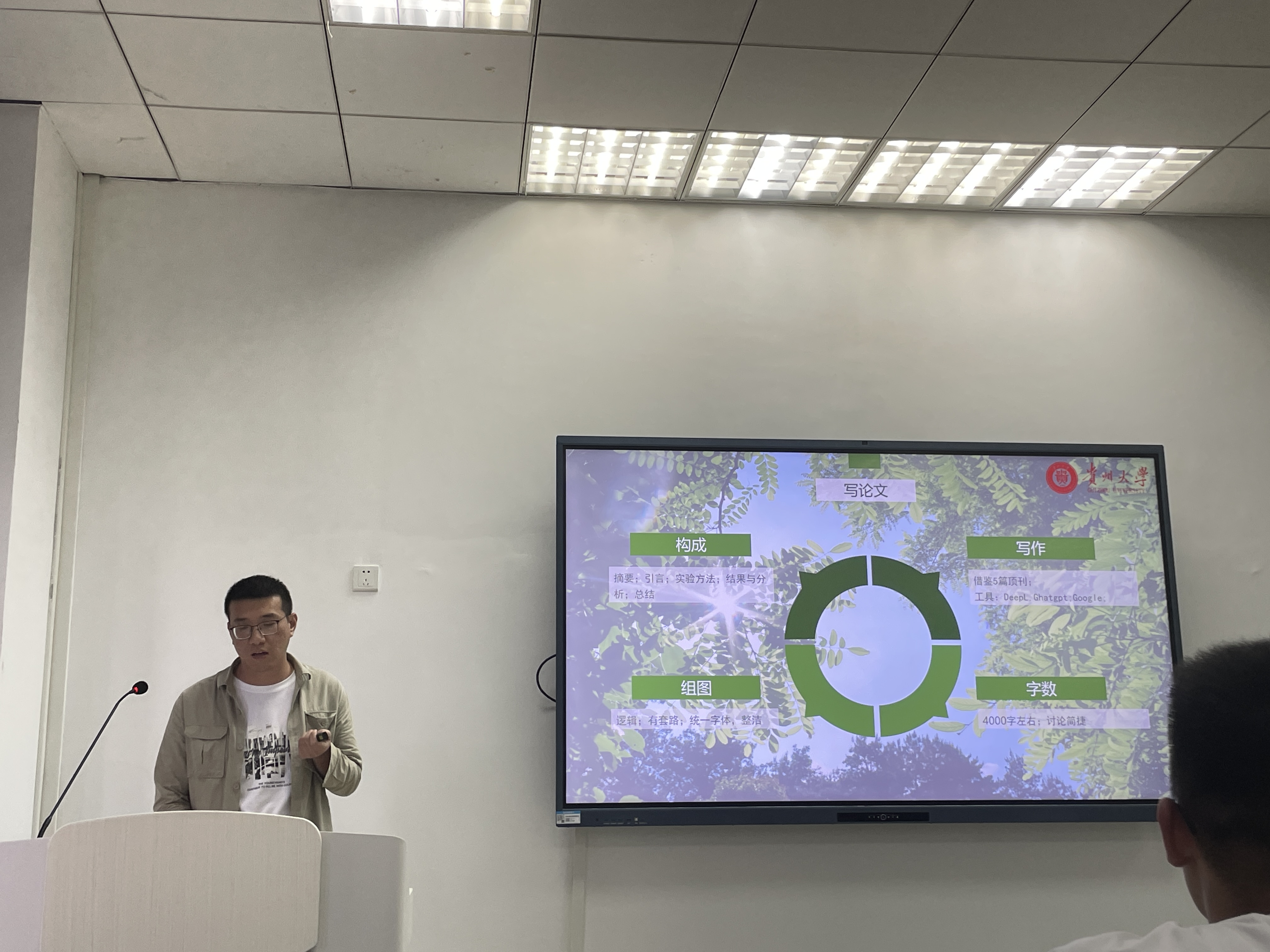 何明蝶等八位优秀毕业生党员进行了汇报,胡桂荣同志进行他的科研之路分享,主要从文献阅读,综述撰写,实验方案设计,数据处理,文献写作等方面进行分享,从为什么做、怎么做、能够取得什么样的结果来带领大家思考怎么去做科研。
