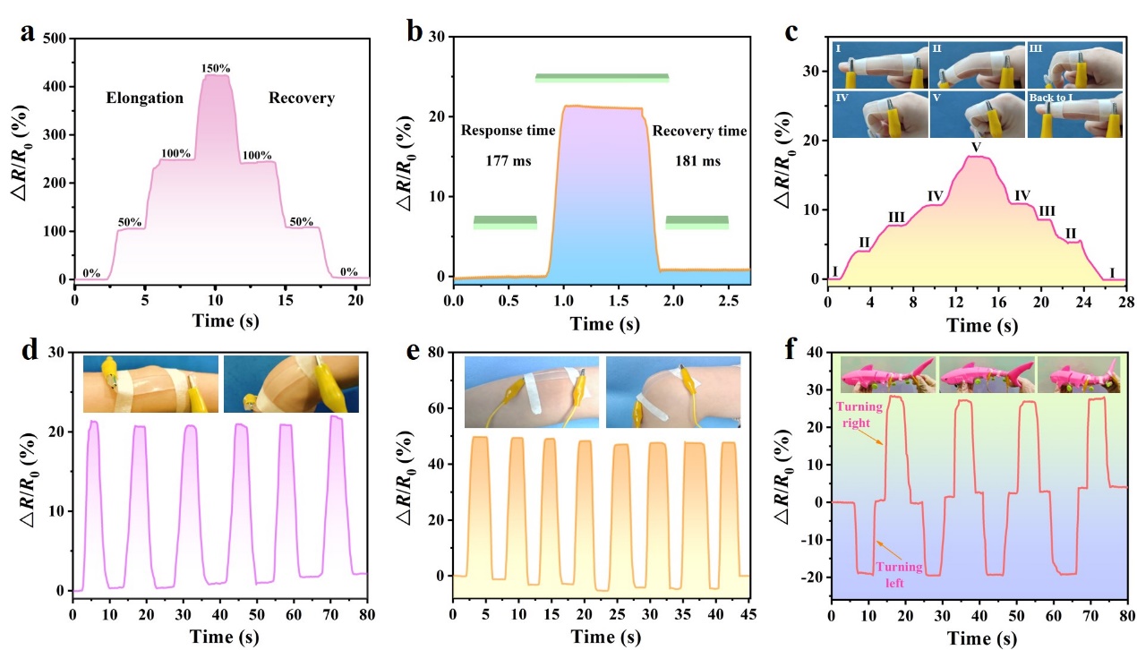 最后将具有优异抗菌性、生物相容性、柔韧性的透明DN水凝胶应用于可穿戴应变传感(图7)。DN水凝胶在拉伸和恢复过程中(10%应变)的响应时间分别为177、181 ms,在0-150%宽应变范围、低温以及室内保存15天表现出优异的灵敏度和对外部应力的实时响应性,将DN水凝胶作为皮肤贴附可穿戴传感器监测志愿者的手指、手腕、肘部以及动物玩具模型均表现出优异的信号可重复性和稳定性,充分说明了CS-PAPILs/PAM/LiCl DN水凝胶在可穿戴式应变传感器中的巨大应用潜力。