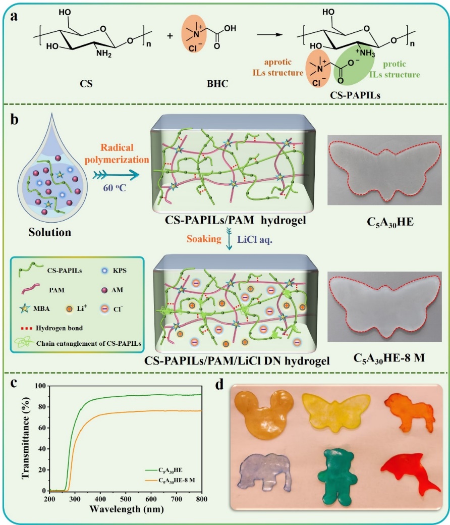 针对以上问题,近期,贵州大学谢海波教授、张丽华副教授团队报道了一种利用壳聚糖和甜菜工业副产物甜菜碱盐酸盐的结构和性质优势,通过分子工程化制备了壳聚糖衍生的聚(非质子/质子离子液体)双网络水凝胶电解质(CS-PAPILs/PAM/LiCl),如图1所示。首先通过质子化制备了壳聚糖衍生物聚非质子/质子离子液体(CS-PAPILs),将CS-PAPILs作为功能组分制备CS-PAPILs/PAM水凝胶,最后通过浸泡策略制备了具有高离子电导率、抗冻、抗菌、生物相容、易加工和高机械性能的多功能CS-PAPILs/PAM/LiCl DN水凝胶。基于该DN水凝胶电解质组装的柔性抗冻超级电容器在-50℃下具有108.4 F/g的高比电容(2 A/g)和5万次的循环稳定性,组装的可穿戴应变传感器具有响应速度快(177 ms)、重复性好等特点,贴附在人体关节上可以很好监测其运动。