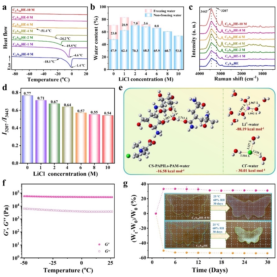 此外,调节LiCl浓度也能有效调控CS-PAPILs/PAM/LiCl DN水凝胶的抗冻性能(图3)。从DSC可以看出LiCl浓度的增加使吸热峰移向更低温度,这源于Li+和水分子形成Li+(H2O)n水化结构,使水凝胶中的自由水逐渐转变为非冻结水,这一现象也在拉曼测试、流变测试和DFT模拟得到了验证。此外该DN水凝胶也具有优异的保水能力。