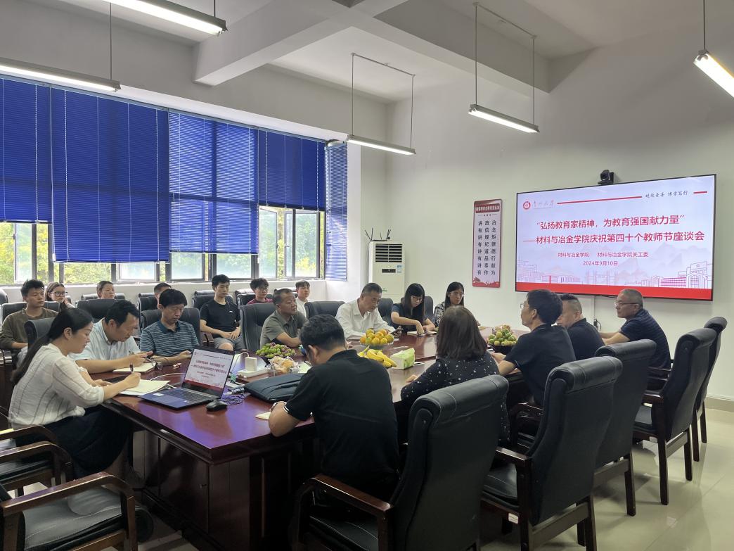 2024年9月10日下午3点,由学院和学院关工委举办的“弘扬教育家精神,为教育强国献力量”——材料与冶金学院庆祝第四十个教师节座谈会在学院425会议室隆重举行。学院领导班子、老教师代表、中青年优秀教师代表、党支部书记代表、近两年新进教师、学生代表参加了座谈会。