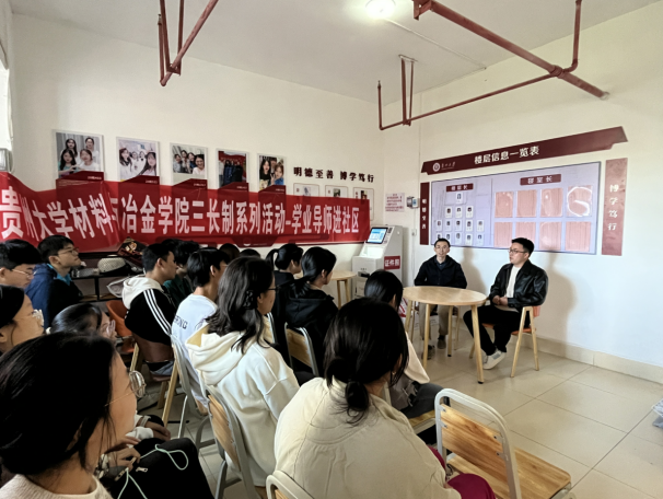 2024年10月25日下午16:50,贵州大学材料与冶金学院三长制系列活动-学业导师进社区在贵州大学西校区20栋学生公寓顺利举行。材料与冶金学院本科生辅导员赵雯、本科生学业导师陈沁、周鹏飞及2024级本科生参加活动。
