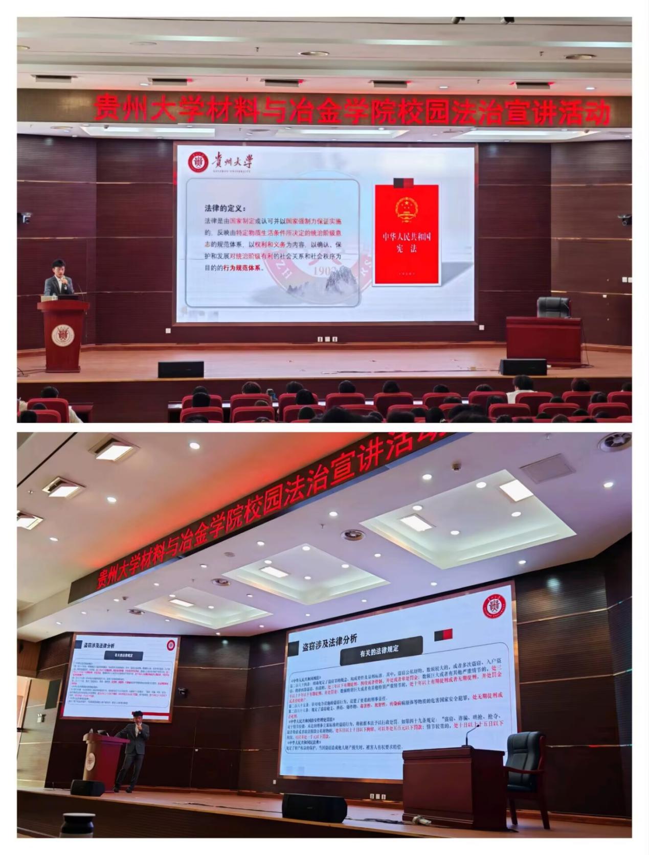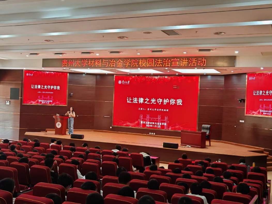 2024年11月11日星期一中午13:00,贵州大学材料与冶金学院在贤正楼107报告厅举行了“让法律之光守护你我”法治宣讲活动。本次活动由法学院2024级硕士研究生路程主讲,学院24级辅导员李云老师主持,2024级全体新生参加。