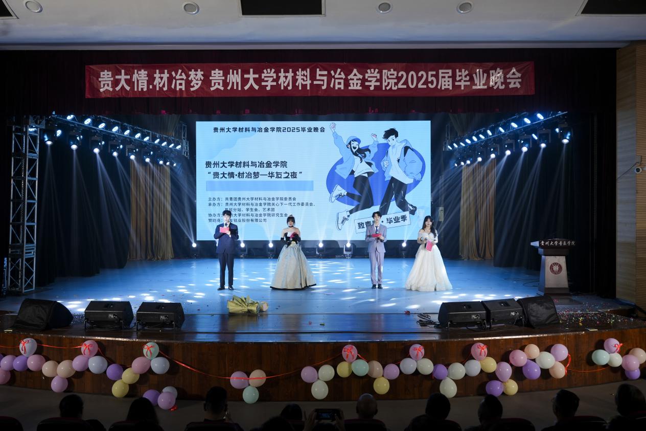 2025年5月16日19时,材料与冶金学院“贵大情·材冶梦”华友之夜2025届毕业晚会在音乐学院报告厅璀璨启幕。本次晚会由材料与冶金学院关工委、团委、学生会、艺术团、易班分站联合承办,学院研究生会协办,并得到浙江华友钴业股份有限公司的鼎力支持。