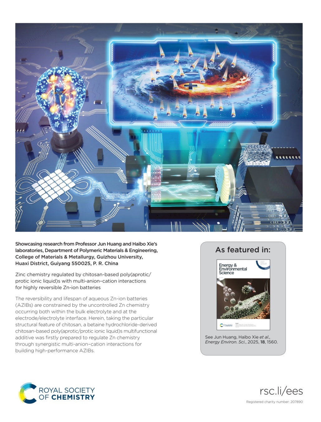 水系锌离子电池(AZIB)是一种极具吸引力的储能选择,具有成本效益、整体安全性和环境友好性。然而,AZIB的可逆性和寿命受到本体电解质内和电极/电解质界面处发生的不受控制的锌化学反应的限制。徐永珍、陈奎同学,利用从虾壳中提取的壳聚糖(CS)的多氨基特殊结构特征,首次制备了一系列坚固的基于CS的聚(质子离子液体)(CPPIL)和聚(非质子/质子离子液体)(CPAPIL),以通过协同阴离子和阳离子来调节锌化学反应。甜菜碱盐酸盐衍生的CPAPILs添加剂(CPAPILs-B)表现出更好的重组Zn2+溶剂化结构和增强通过羧酸根和氯根阴离子的离子传输的能力,而CPAPILs-B中的质子化胺和季铵阳离子有效地锚定在Zn负极上,提供充足的亲锌位点和均匀的电场。因此,具有多阴离子-阳离子相互作用的CPAPILs-B赋予Zn//Zn对称电池在1 mA cm-2/0.5 mAh cm-2下的长期循环耐久性为5925小时,在10 mA cm-2/1 mAh cm-2下具有超过7550 mAh cm-2的超高累积电镀容量(CPC)。相关研究内容以题为Zinc Chemistry Regulated by Chitosan-Based Poly(aprotic/protic ionic liquid)s with Multi-Anion-Cation Interactions for Highly Reversible Zn-Ion Batteries,以内封面论文的形式发表在材料科学国际顶级期刊Energy & Environmental Science(EES,《能源与环境科学》)上发表。EES是能源与环境领域的顶尖学术期刊,2023年影响因子为32.5。学院2022级硕士研究生徐永珍、2021级博士研究生陈奎为共同第一作者 (导师:谢海波教授),谢海波教授,黄俊特聘教授为共同通讯作者。