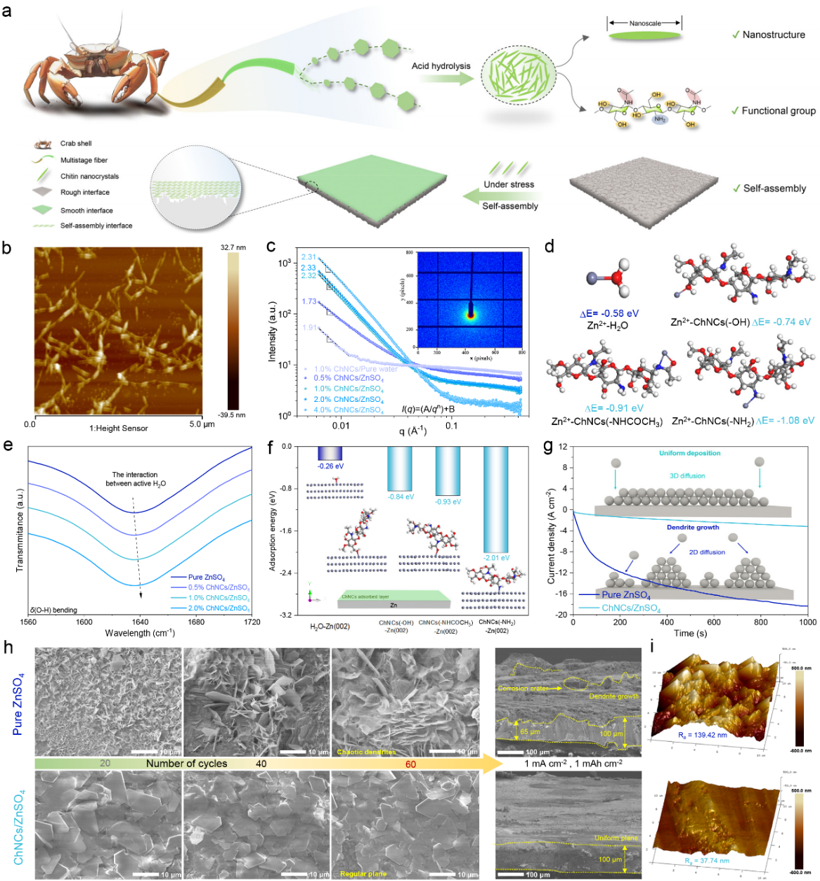 针对以上问题,我校黄俊特聘教授团队开发了纳米级的纤维素纳米晶和甲壳素纳米晶材料,将其用于水系锌电池电解液添加剂,显著提高了水系锌电池的库仑效率和使用寿命。研究发现,得益于纤维素纳米晶和甲壳素纳米晶独特的物理和化学特性,它们可作为快速离子传输的载体,使锌离子通量均匀化,协调锌离子的快速迁移,从而促进锌离子的定向传输以增强其传输动力学。在电化学反应过程中,它们可以在锌阳极表面进行原位组装,有效调节锌的电镀/剥离行为,促进其均匀沉积,大幅抑制了界面副反应的发生和枝晶生长。重要的是,在电镀/剥离过程中,它们可以实现对锌阳极的动态保护,确保锌阳极的高效持续工作。结果表明,只需在水系锌电池电解液中添加少量(< 1%)的纤维素纳米晶或甲壳素纳米晶材料,无论是在扣式电池还是软包电池中都获得了卓越的倍率性能和循环稳定性。这种简单、环保、高效的多功能电解液添加剂工程可以扩展到受动力学迟缓和稳定性差限制的其他金属离子电池中,为开发高效的电化学储能技术提供一条新的途径。