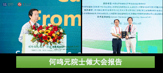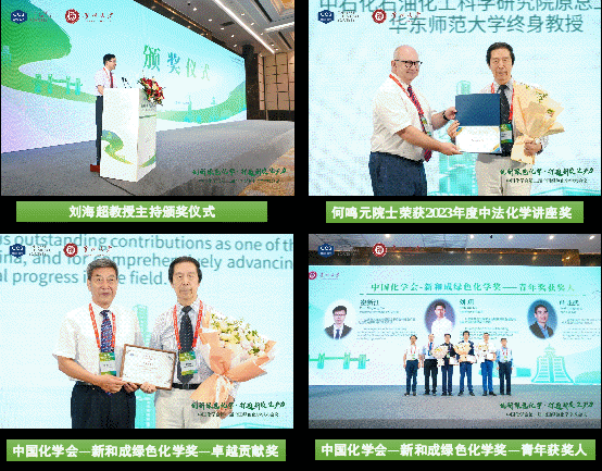 开幕式由北京大学刘海超教授主持,贵州大学谢海波教授首先代表会议组委会致欢迎辞,随后大会主席韩布兴院士致辞。出席开幕式的嘉宾和代表有何鸣元院士、韩布兴院士、张锁江院士,李景虹院士、宋宝安院士、Prof. Yves Queneau、钱蕴华教授、中国化学会代表韩立冬、贵州磷化(集团)有限责任公司刘松林副总经理、贵州大学材料与冶金学院党委书记刘剑、党委委员熊玉竹,各联合承办单位、协办单位、赞助单位及参会代表400余人。开幕式期间,举行了2023年度中法化学讲座奖(2023 China-France Chemistry Lectureship Award)及中国化学会—新和成绿色化学奖颁奖仪式。何鸣元院士荣获2023年度中法化学讲座奖与首届中国化学会—新和成绿色化学奖—卓越贡献奖;崔新江、刘玥、叶龙武三位青年学者获得首届中国化学会—新和成绿色化学奖—青年奖。会议期间,李景虹院士专程来贵阳给何鸣元院士颁奖,祝贺何院士同时获得两项殊荣,感谢其作为我国绿色化学学科的奠基人之一,全方位推动绿色化学的理论创新与技术进步等做出的卓越贡献。