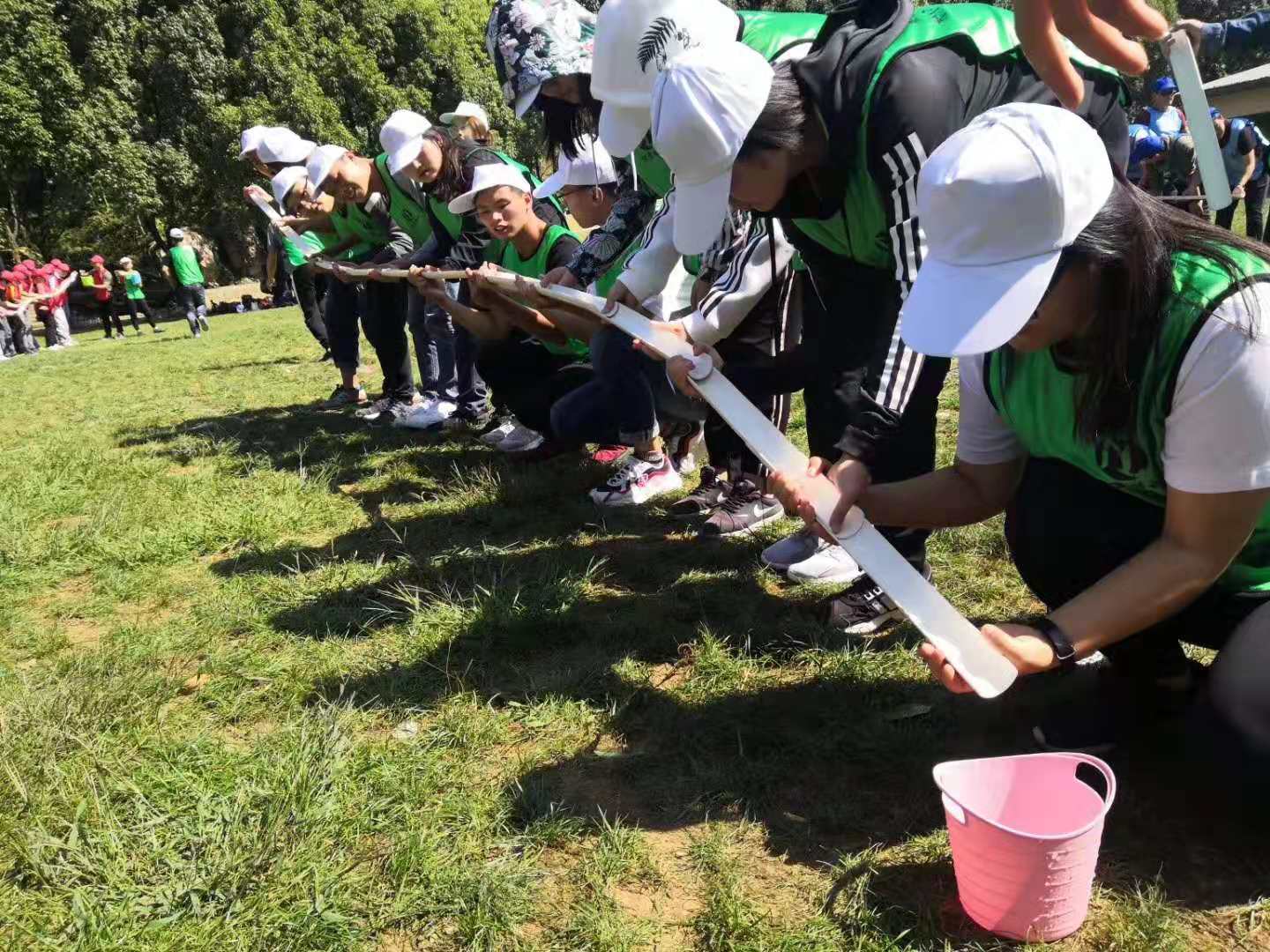 水到渠成项目是指队员中每位伙伴拿一块PVC管子在起点排成一排,然后倒上一杯水通过PVC管,第一位跑到最后依次衔接直到水倒满瓶子。该项目很好地体现了细节决定成败的理念,是让每位学员都要做好自己的本职工作,合理安排人员,才能做到水稻渠成。